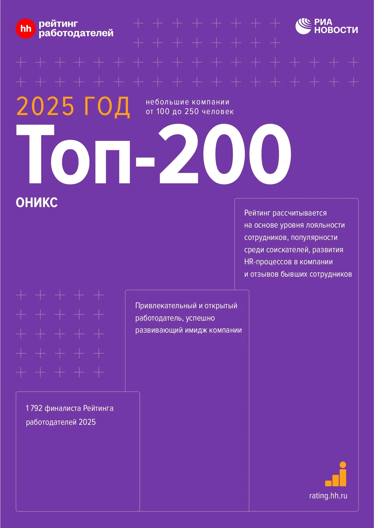 Компания ОНИКС вошла в ТОП-200 компаний Рейтинга работодателей HeadHunter по итогам 2025 года в категории небольших компаний (от 100 до 250 сотрудников). Мы заняли 117 место среди 600 финалистов рейтинга.